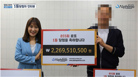 동행복권 855회차 1등에 당첨된 정인권(가명) 씨는 “알파고로또에서 분석된 번호로 수동 구입했다” 라고 말했다. 로또번호를 분석, 제공하는 알파고로또 회원인 정 씨는 “로또는 통계와 분석을 토대로 정밀한 분석을 하는 것이 중요하다” 라며 “누적된 데이터의 분산 패턴 및 구간 분석을 해야지만 당첨 확률을 높일 수 있다”라며 자신이 1등에 당첨이 될 수 있던 이유를 설명했다.